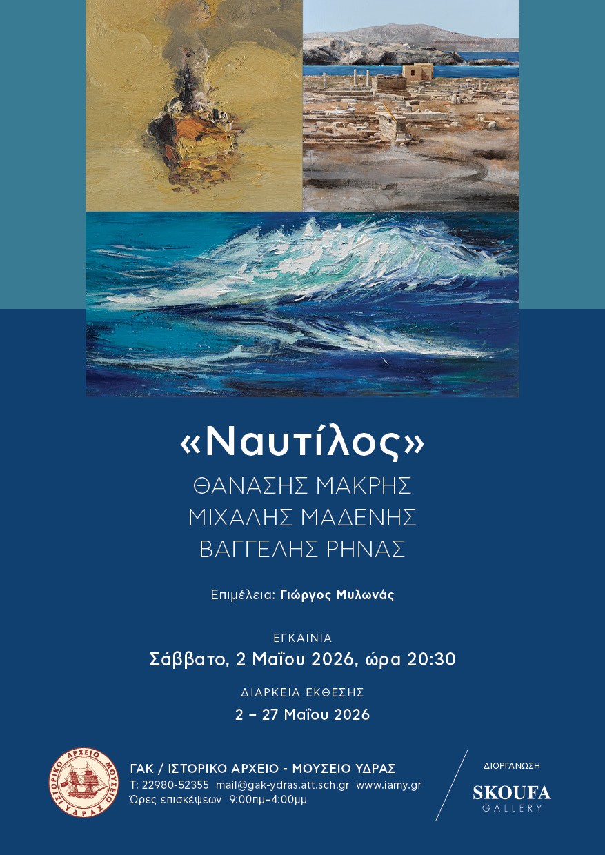 Historical Archives-Museum of Hydra| “Nautilus” | Thanasis Makris, Michalis Madenis, Vangelis Rinas | May 2–27, 2026 HYDRA INFO I didn’t find spring so much in the fields, or even in a Botticelli, as in a small red palm-bearing icon. And so one day, I felt the sea while looking at a bust of Zeus. When we discover the secret relationships between concepts and explore them in depth, we will emerge into a different kind of clearing, which is Poetry. And Poetry is always one, just as the sky is one. The question is from where one views the sky. I’ve seen it from the middle of the sea. Odysseas Elytis,, Little Nautilus So, if the question is “from where does one view the sky,” then, for the painter, the question shifts: what does he see within the sea and, above all, through what gaze. For the sea, however obvious it may seem as a subject, resists simple representation. It is not merely surface or depth, nor exclusively light or movement. It is a realm where things shift from their axis: outlines soften, distances expand, color becomes time. The painter standing before it—or, more precisely, within it—does not seek to represent, but to preserve, through the medium of painting, something of that “mysterious relationship.” Three painters—Thanasis Makris (1955), Michalis Madenis (1960), and Vangelis Rinas (1965) —travel to Hydra , responding to an inner calling: through the act of painting, they seek a spiritual identity forged in the space and light of the Aegean. The sea in their work emerges as the other Greece. Through the convergence of the three, the exhibition titled “Nautilus” takes on the significance of an instrument: it regulates the path of the gaze, directs it toward an inner depth, and reveals the way in which the image coalesces into experience. Makris’s “Libertys”—World War II cargo ships—become banners of liberation from form. Their mass dissolves into the water, as if testing the very limits of their existence. The freedom they proclaim is a fluid, fragile state, a constant transition from matter to light and from the visible to the inner reflection. Their destination resembles the landscape of Madeni, a timeless shoreline, as if drawn from myth. Hydra breaks free from its geography and shifts to a place that cannot be located—a utopia in the literal sense, a non-place. In The Wave, painted specifically for the Historical Archive – Museum of the island, the artist captures in an explosion of color all the vitality, the play of the waves, the scent of the abyss; there where, as has been said, “the spirit of truth lies in the waters that are constantly changing.” On a parallel trajectory, Renas turns toward Delos, arranging the volumes into an architectural balance. In this painting, one recognizes the Greek gaze that saw the landscape as a bearer of order and measure: the Apollonian field in his homeland, where the gaze finds its course not through fluidity, but through clarity. And the landscape takes on a timeless character, as if it belongs simultaneously to the present and to a primordial time. The time of consciousness is not singular; it is not the same for every experience. Nor does every experience have its own fixed time. Experiences are not stars in the sky of consciousness. Their meaning, their position, their course—all are subject to reversal and transformation at every moment. The sky of consciousness does not resemble the one we see; it is waves without fixed positions. At any moment, nothingness transforms into something. Nothing is a given, not even nothingness. Outside the Museum, the viewer will find themselves facing the sea. Perhaps then they will see the sky as the painters saw it… Curator: Giorgos Mylonas GSA/HISTORICAL ARCHIVES – MUSEUM OF HYDRA Opening Hours 9:00 – 16:00 The exhibition is presented with the support of Skoufa Gallery. Learn more about the artists at skoufagallery.gr EVENT NAME: «Ναυτίλος»| Θανάσης Μακρής, Μιχάλης Μαδένης, Βαγγέλης Ρήνας CONFERENCE CENTRE: Historical Archive-Museum of Hydra START DATE: May 2 2026 END DATE: May 27 2026